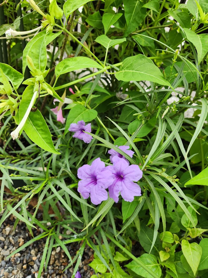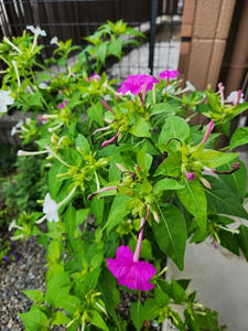 涼しいせいか毎日長くオシロイバナが咲いている。赤・白・ピンク混じりの3種。丈が1メートル以上と、大きくなりすぎて倒れるので何回か切り戻した。何も肥料は上げてないが賃貸庭の砂利の下の土が肥えているのだろうか。以前は畑だったのかな?と時々思っている。とはいえ、このマンションが建って22年以上経過しているので雨水とお日様のせいかもしれない。