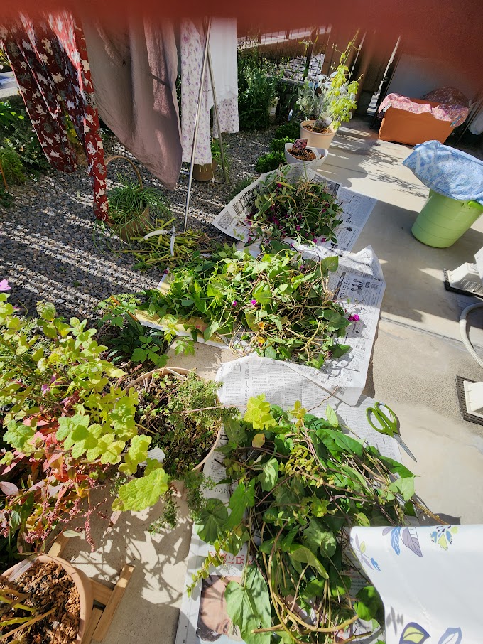 夕顔のほかに千日紅やオシロイバナもある程度カットしたので30リットルのごみが出た。1時間以上もかかってしまう。その間にカーテンを洗って窓ガラスを拭いて・・・暖かな良いお天気でありがたい。
