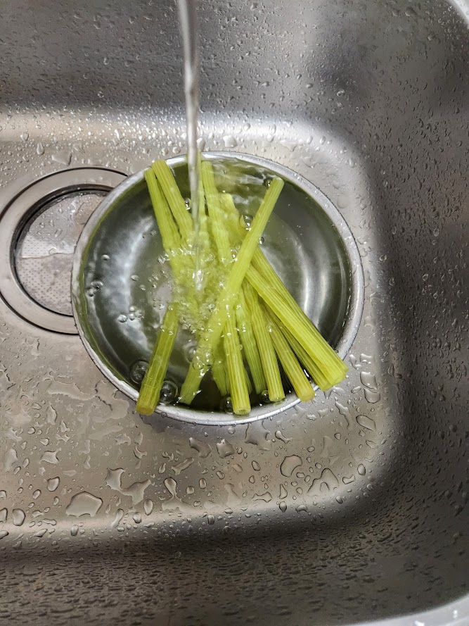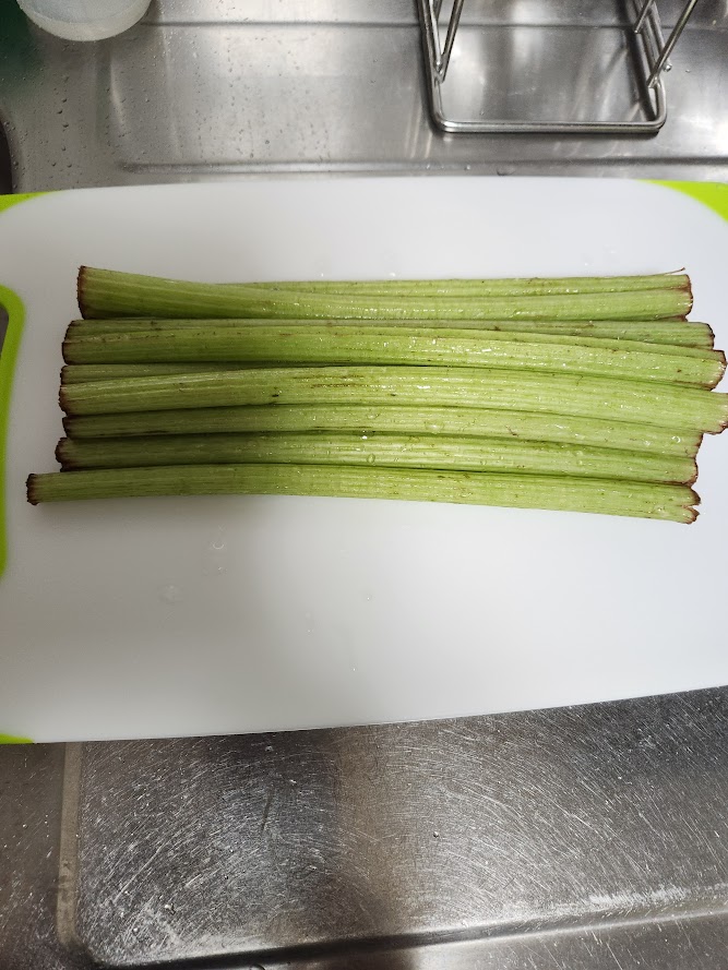 傷んだ両端を切り落とし、塩をふりかけズリズリとしてフライパンの中で塩がついたまま放り込む。4~5分ほどして水にとり皮をむいてゆく。あとは適当な長さに切り水を入れたタッパで冷蔵庫で数日はもつ・・・そのあいだに料理を考えよう。塩でズリズリしていたらフキの臭いがしてきた。ゆで加減を見るためにかじったら、フキの味だ。苦くはないけどまだおいしくはない。