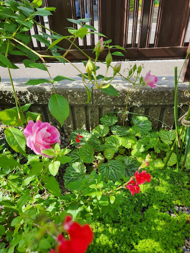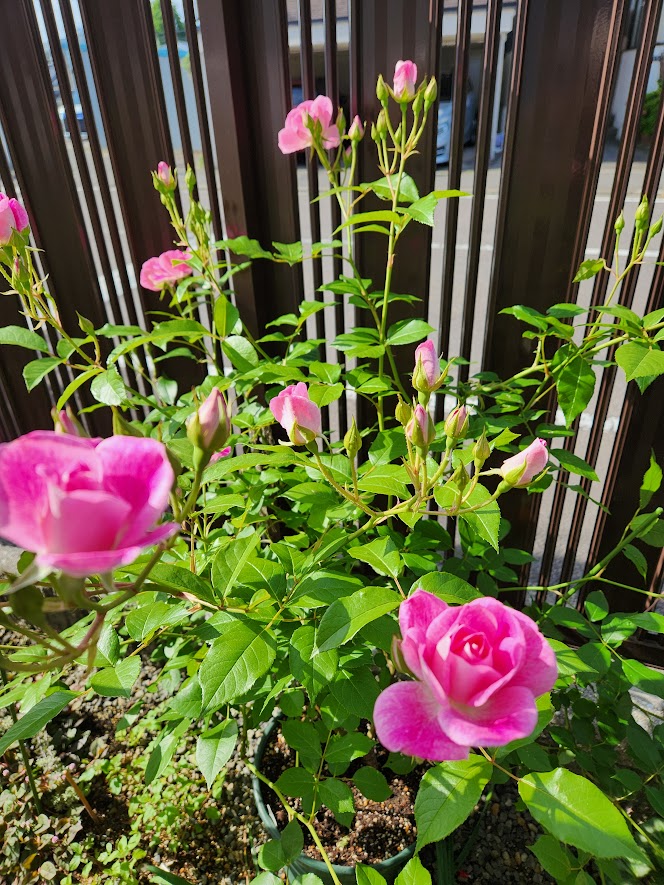 鉢植え、ピンクブリリアントアイスバーグは花付きがとてもよく、可愛い。アブラムシが少しつくので手で取る。日陰でチェリーセージや草花と一緒に咲いてる感じが好き。