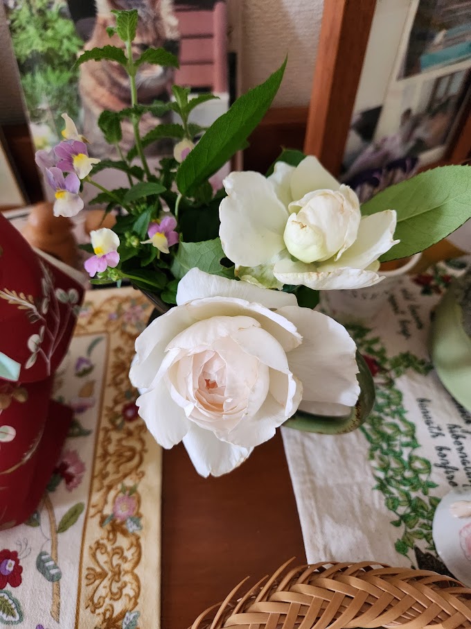元の庭に置いてきたボレロの香りが忘れられなくて去年苗を買い鉢植えにしていたものが今朝咲いた。雨予報だったので2輪切って飾る。夕方になりとても良い香りがした。