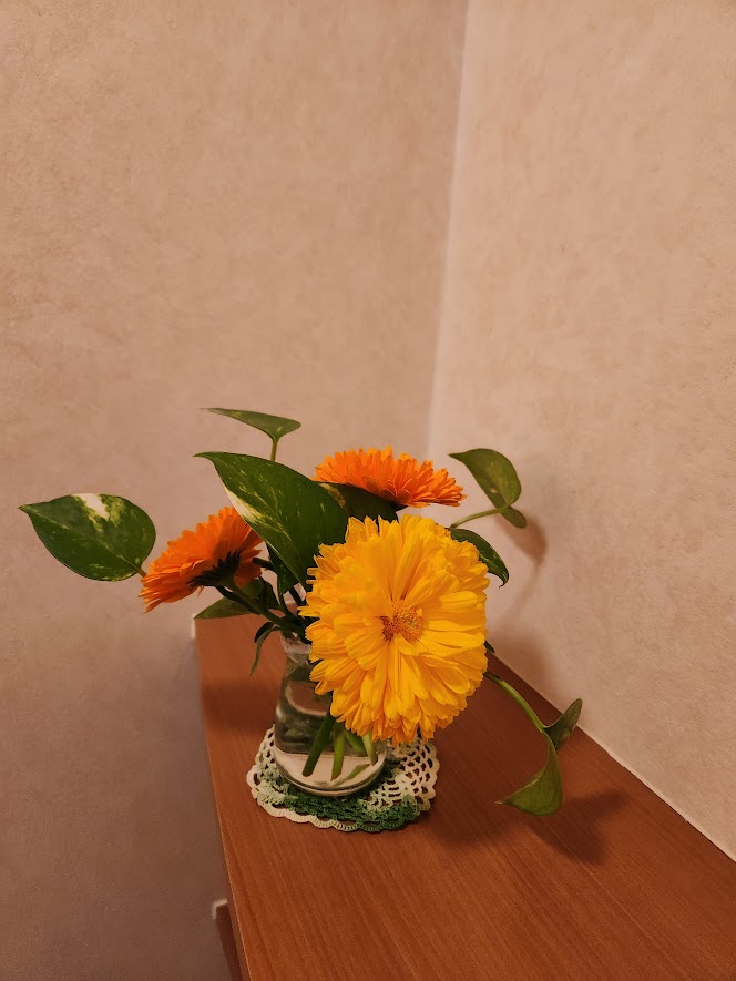数日前に買ったカレンデュランを少し早いかな無理かな?と思いつつ地植えした。温室で育てたのだろう、大きな花が咲いていたので切ってトイレに飾った。思えば今年はというかお正月も切り花を一度も買わなかった。不精になったなあ、水替えが面倒で、枯れてくるのがいやで、かといって造花は嫌だし。いつも室内にある観葉植物ポトスの葉っぱを切って少し飾って「これでいい、緑がいちばんきれいだ」と自己満足していた。