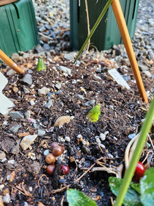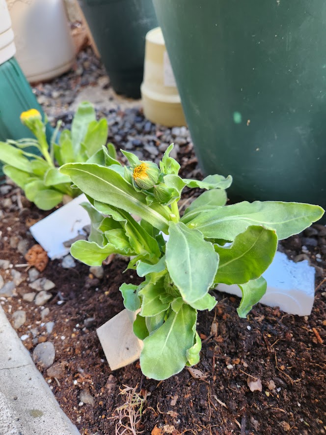白いのは発砲スティロールのきれっぱし。土が凍らないように、そして風よけのために鉢植えの後ろに植えてみた。春までに成長するか、枯れるか?