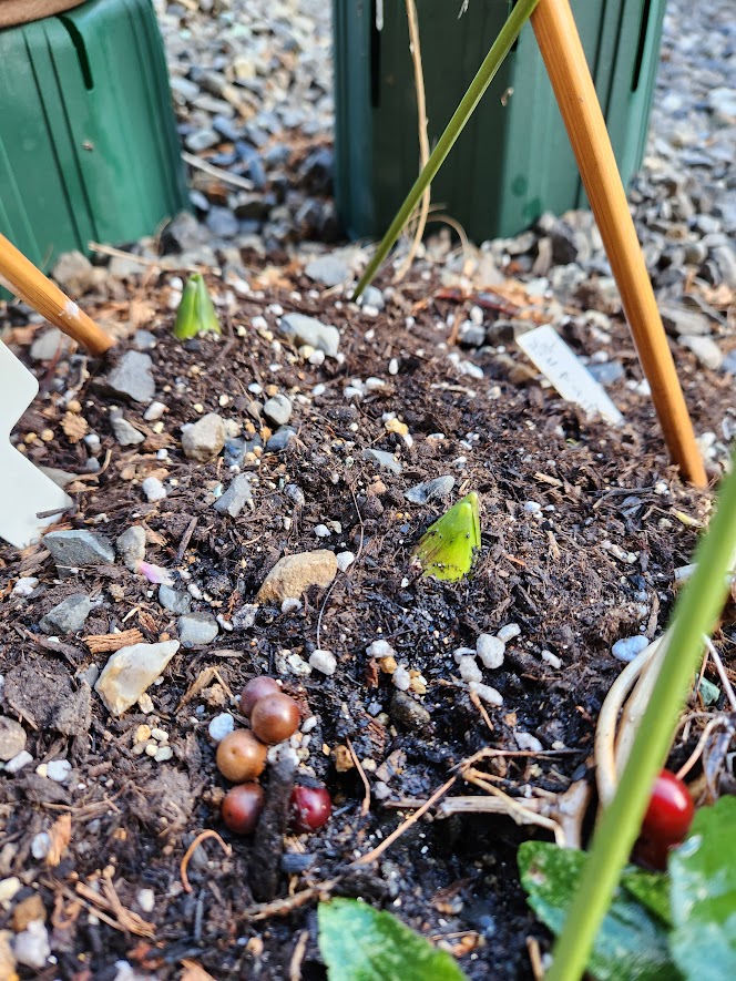 ヒヤシンスもまだ3センチも芽が出てない。咲いたものも売られているのに。昔、庭があった時、咲いたものを次々に買い、楽しんで終わったら地植えした。翌年は花は小さくなるけれど自然風で良い感じだった。ここには2球しか植えられなかった。この辺りは死んだセミとか埋めているのであまりいじりたくはない。