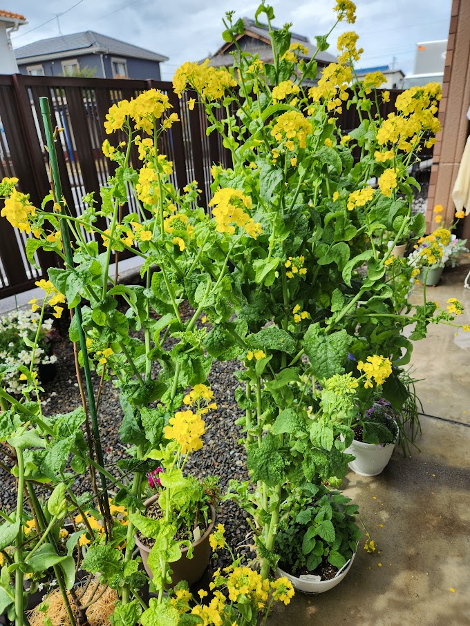 昨夜からの雨と風でベランダは荒れていたものの、菜の花は運よく半分ほどカットした直後だったのでそのままの姿だった。