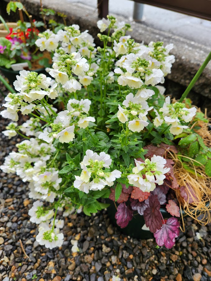 ネメシアは昨秋の10月ころに小さな苗を鉢植えしたら雪や霜にもめげず今日にいたる。カインズで買った苗が良かったのかもしれない。バラの株元に土が見えないようにと植え込んだが、そろそろ処分しないといけないかな?
