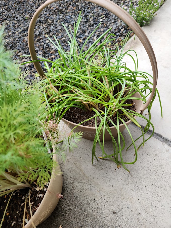 ムスカリは鉢植えで植え込んだ。花が終わり葉っぱだけ残して来年も咲かせたい。