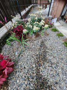 どういうわけかこの画像だけはうまくいった。白い野菊の前に3本の葉ボタン。春になり菊が枯れて無くなったころに葉ボタンの花が咲いてくれると思う。小さな砂利庭に穴を掘り培養土を入れ、また砂利で固めた植え方をしている。この砂利の下には結構良い土があるので以前は畑だったのかしらん。歩くと音がして防犯にもなるし。