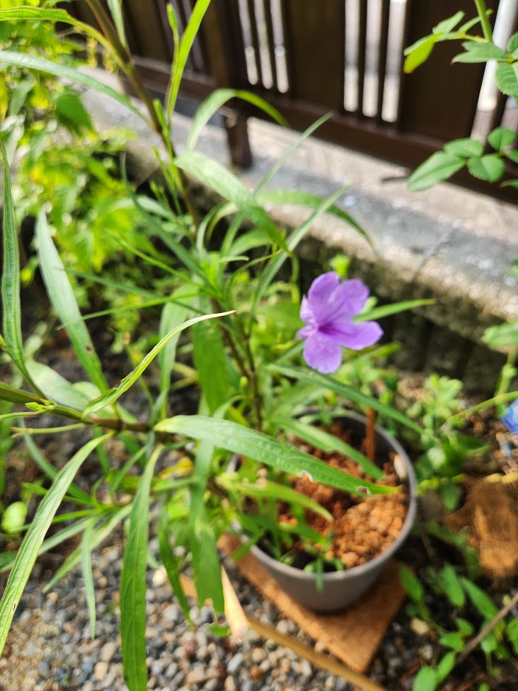 先日欲しそうな顔して見ていたら、780円でいいよと店主に言われ買って、ひと周り大きめの鉢に植えたルエリアパープルシャワーが1輪咲いた。嬉しくてたまらない。3年前から育ててみたいと思っていたのでもうこれから鉢を大きくして来年も咲いてくれたらいいな。オシロイバナも丈を切り詰めたら咲いた。