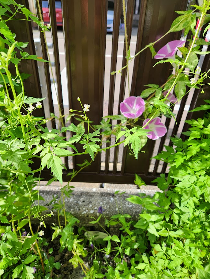 この賃貸マンションは2LDKの小さな部屋だが1階なので小さな砂利庭がついている。この春先に、持ち家から持ってきた鉢物少しと種を撒いた植物たちが育って緑でフェンスを隠してくれる。