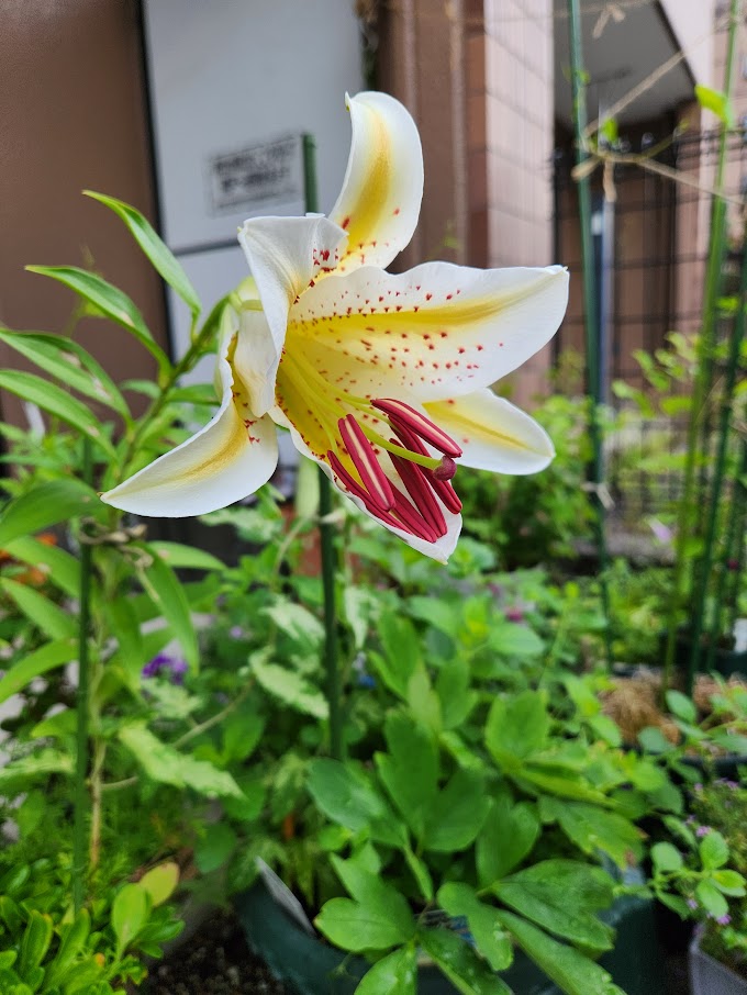 葉はボロボロだけどまさか山百合のような大きさのが咲くとは思わなかった。去年棒きれみたいで1年すごしたから、今年は処分しようかとさえ思ていた。今年は咲かなかったけどもう一つのも