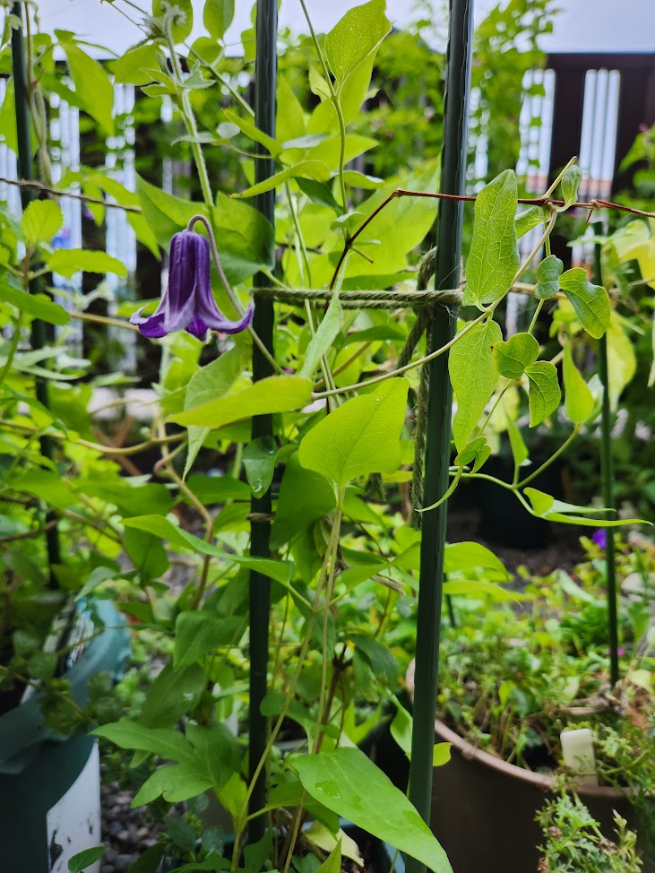 グリーンが目立つ庭(賃貸1Fで庭と呼んでいいのかわからないけど)。花も葉も水&お日様は必要だ。クレマチスの鉢を日当たりの良い場所に移動させたら花をつけてくれた。
