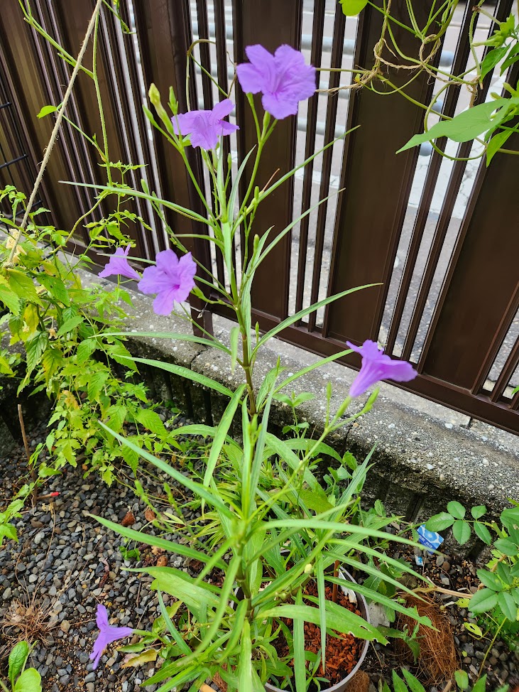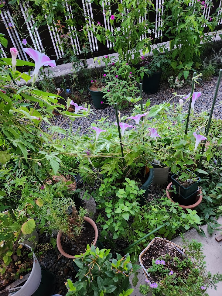 鉢植えの昼顔はピンク色で華やぐ。朝起きてウキウキする。2週間前に格安で買った鉢植えパープルシャワーも朝早くから咲いてオシロイバナが開花する頃には自然に花が散っている。手間がかからない。店主の言うとおりだった。「これは今から秋まで咲くよ」