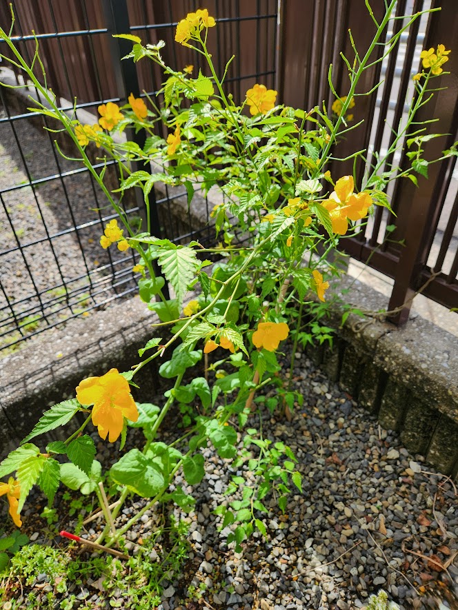なるべく植物は増やさないと決めて、地植えする植物は引っこ抜きやすいものを植えるようにしてきた。例外は山吹だ。一重の山吹が大好きで前の家から株を少し持ってきたのが2年目で咲いた。終わりかけの菜の花とコラボしているので花数が多く見えるが実際は10輪程度。