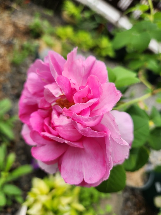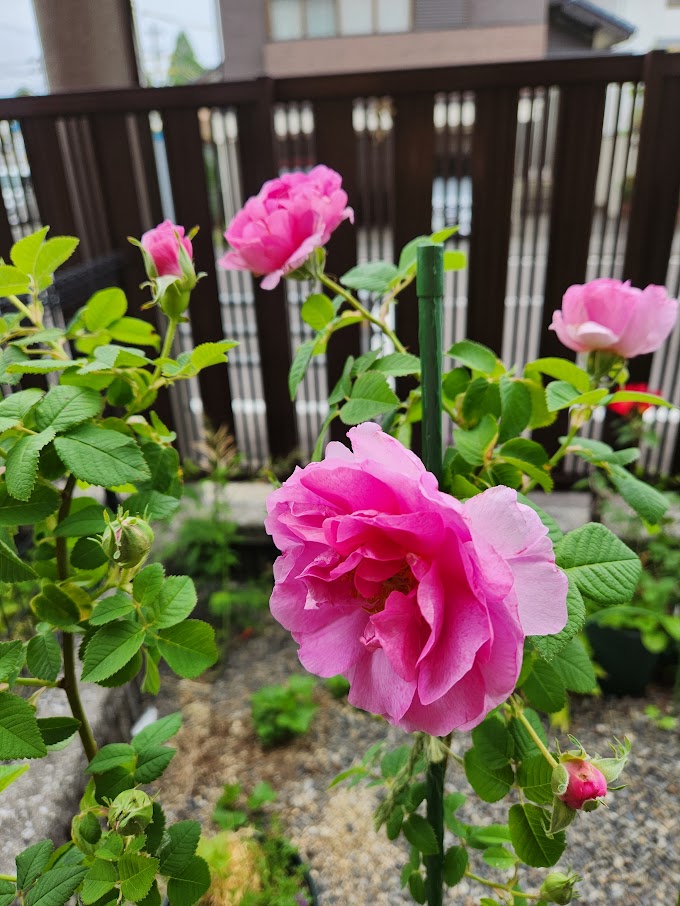 ガリカローズのジョセフィーヌ。 春しか咲かないバラで香りがもっとするかな?と期待していたら、花の様子ともども違っていた。来春もきれいに咲かせるには冬に鉢の土を変えて・・肥料もあげ・・などと考えると億劫になってきて、ばっさり切ってしまった。冬に残った根っこを引っこ抜く予定で鉢は他の植物のために支柱を立てていたためすぐにはカラにできなかった。