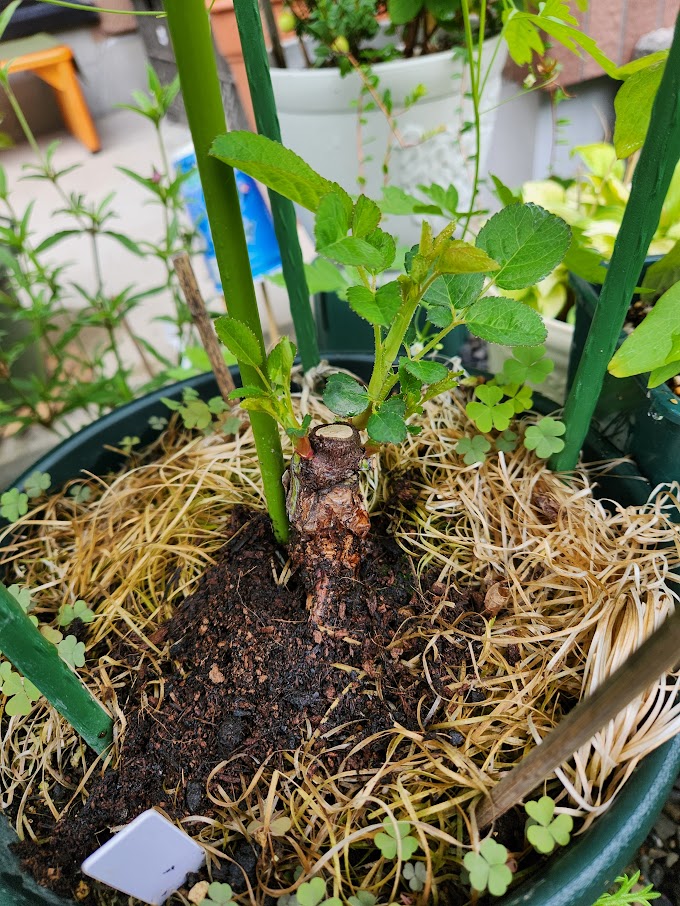 それからひと月ほど過ぎるころ新しい芽が出てきた、え?生きてたの?と思ううちに今は7センチほどまで葉を展開させている。台木の野ばらではないと思うけれど・・・接ぎ木の上だから。