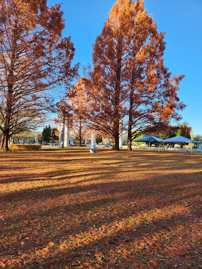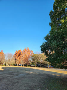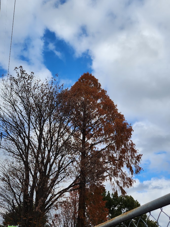緑が濃くて樹形がきれいだったメタセコイヤももうすぐ裸になってしまう。茶色というか赤茶色の葉が地面に落ち歩くとフカフカ。買い物に行くときに公園の中の木々を眺めながら歩く。それまでウツウツとした気持ちもどこへやら。