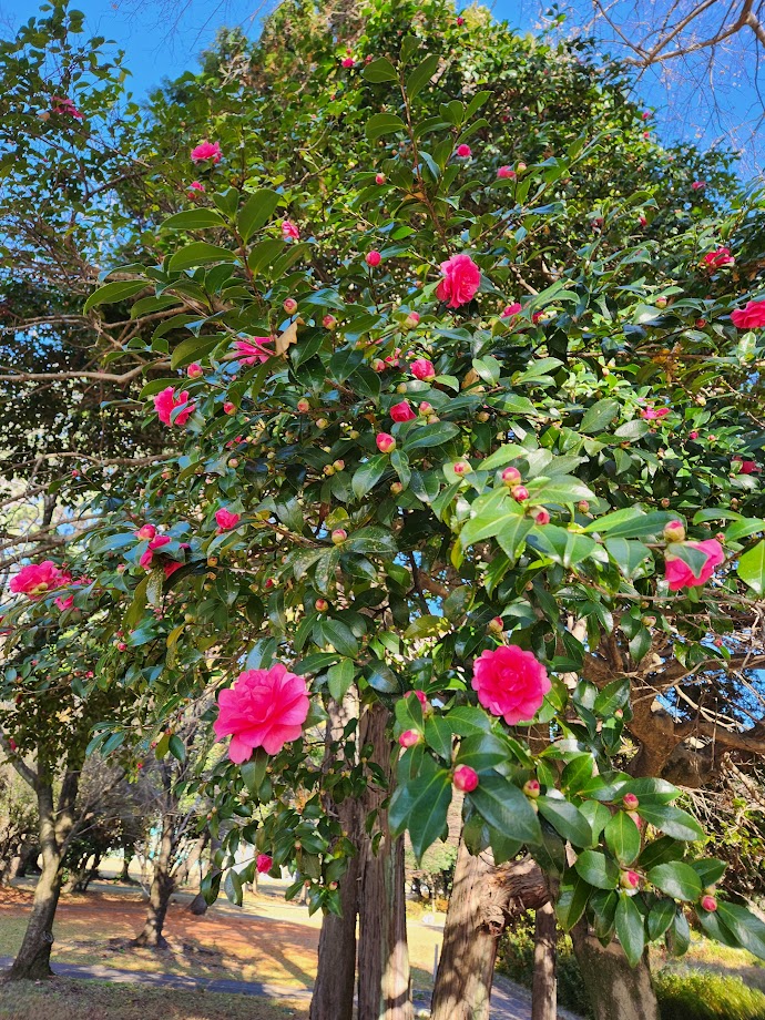 きょう、公園の中を歩き買い物へ。ここにも山茶花が見ごろ。赤いものもあったが小鳥が近くで何かをついばんでいるので撮影はやめた。