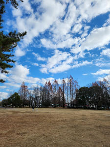 メタセコイヤはほとんど葉を落としピラミッド樹形が青空にそびえたつ。