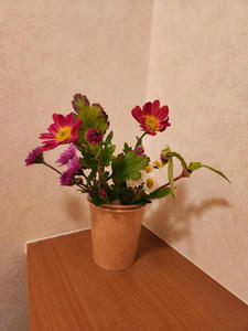きのう、あるお宅の前に「よろしければ、どうぞ」と小菊がバケツの中にあった。それと野菜も少し・・・小菊だけ2本いただいた。自宅には白しかないのでちょうどいいな、と思い。「ありがとうございます」と、見えない主に、おうちの前を通りすぎるときにお礼を言う。