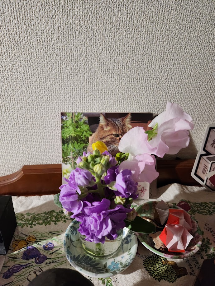 昨日切り花を久々に買った。短く切って・・・ストック・フリージア・スイトピーどれも香りのよい仲間たち。私の寝る部屋が良い香りに包まれて幸せ。
