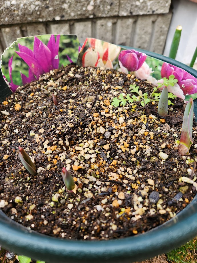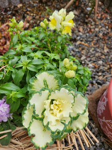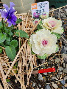 クロッカスやチューリップも少し芽が出てきた。葉ボタンは相変わらず雪が降っても平気だ、ビオラやパンジーも冬花壇の主役。黄色い花はキンギョソウ?だったかな。