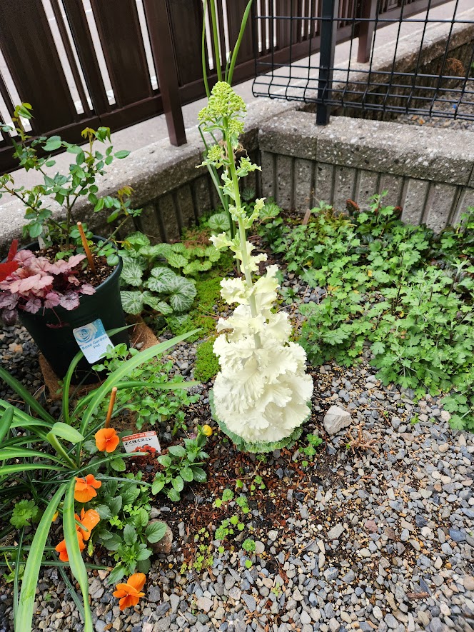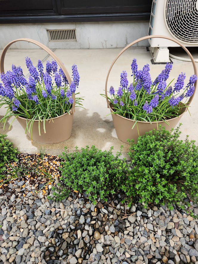 我が家の小さなベランダ庭ではムスカリと葉ボタンが元気いっぱい。最初の姿とまったく違うなあと葉ボタンの成長にはびっくりする。ムスカリは傷んだ葉を半分ほどカットしたらきれいになった。
