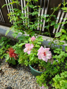 鉢植えアイスバーグのピンクは夏場も絶え間なく花を咲かせてくれる。本来は10センチほどなのに、小ぶりでこれはこれでカワイイ。昔バラ狂いしていたころ、夏場は秋のために咲かせなかったけれど、今はいつも花を見ていたい。
