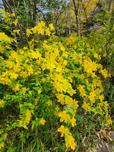一重の山吹も見ごろ。白い花は「梨の花」だった。利休梅も同じように咲いていて遠目には一緒に見える。