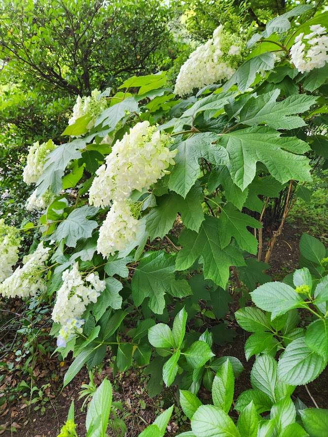 カシワバアジサイは葉が茶色のと緑のがある。初めて育てたときはきれいな緑色の葉っぱだったので、次に育てたのは茶色で何かの病気かな?と思ったけどそういう品種があるようだ。近所でも時々目にする。