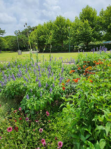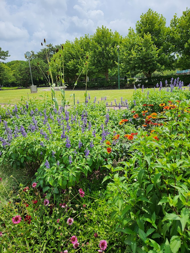 花壇にはサルビアセージが暑さにも昨夜からの大雨にも負けずきれいに咲いていた。