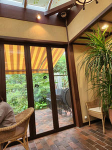 クラブハリエの店内、ガーデンが見えるものの花が少ない時期のため緑が目立つ